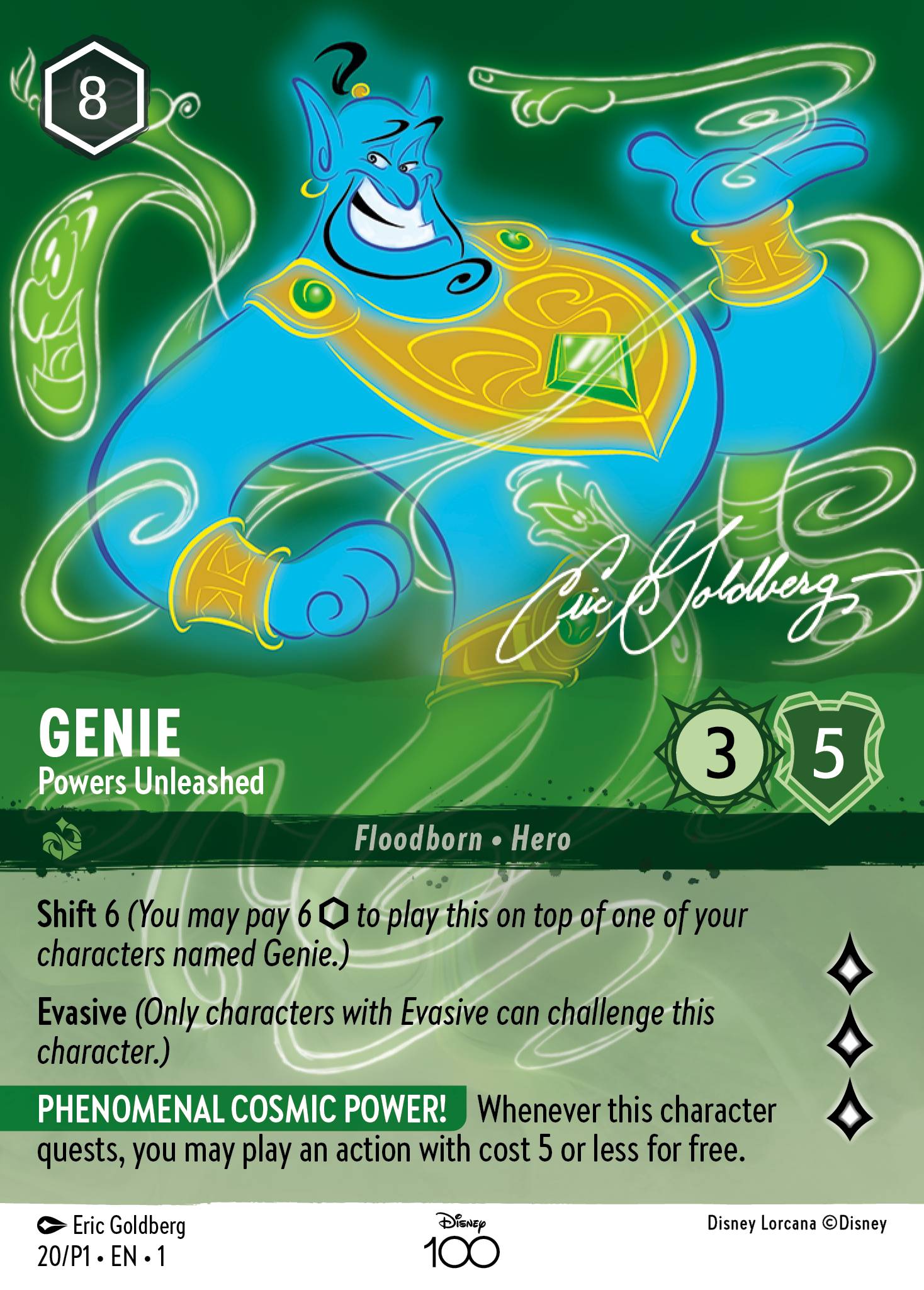 Shift 6 (You may pay 6 ⬡ to play this on top of one of your characters named Genie.) Evasive (Only characters with Evasive can challenge this character.) PHENOMENAL COSMIC POWER! Whenever this character quests, you may play an action with cost 5 or less for free.