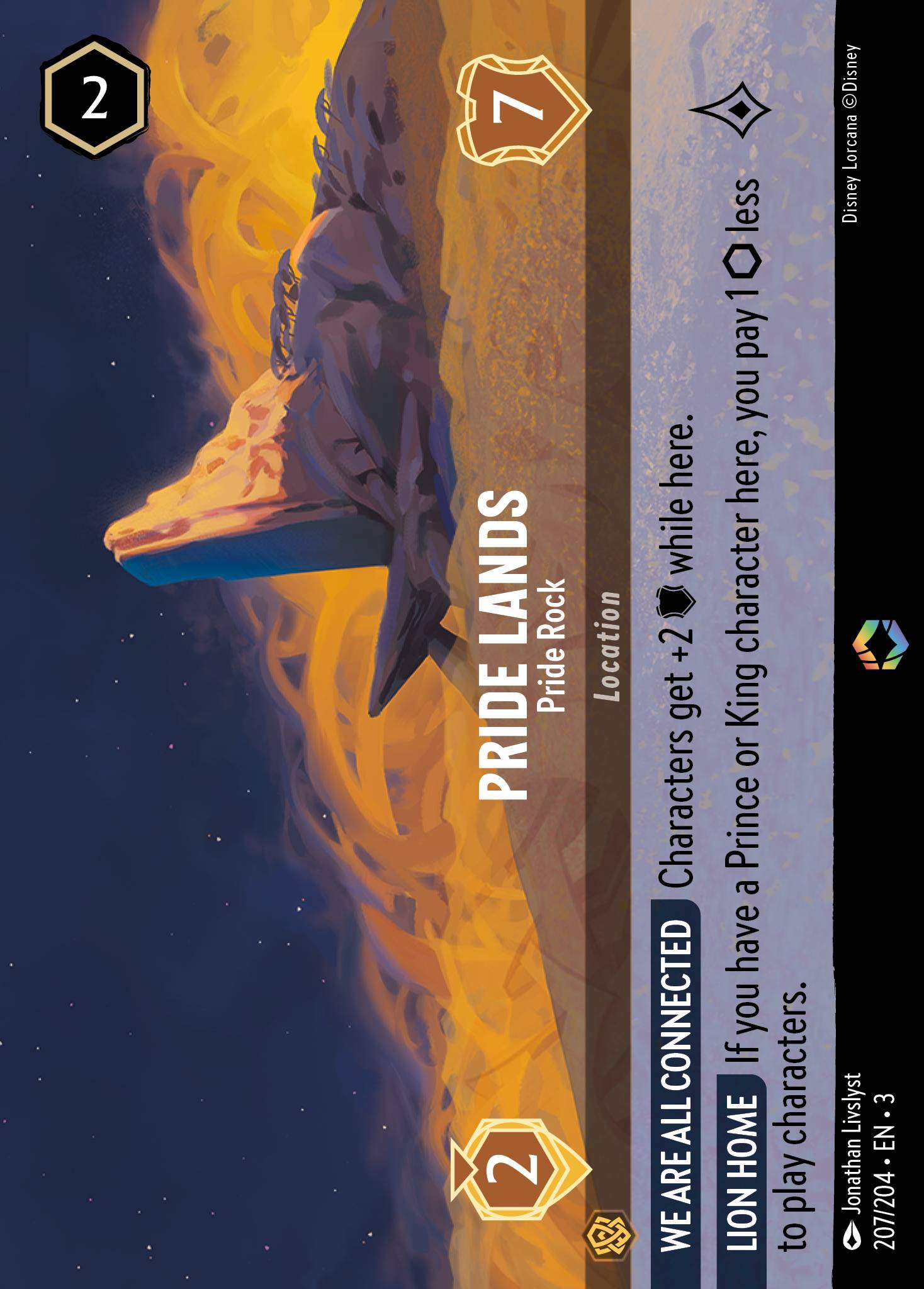 WE ARE ALL CONNECTED Characters get +2 ⛉ while here. LION HOME If you have a Prince or King character here, you pay 1 ⬡ less to play characters.