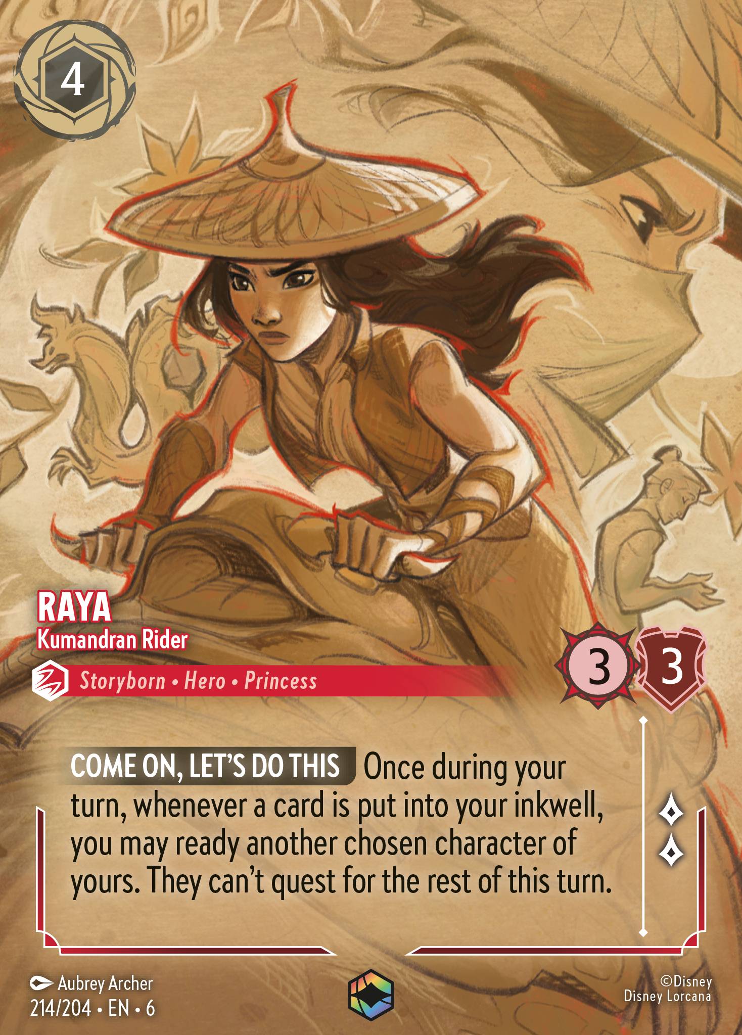 COME ON, LET'S DO THIS Once during your turn, whenever a card is put into your inkwell, you may ready another chosen character of yours. They can't quest for the rest of this turn.