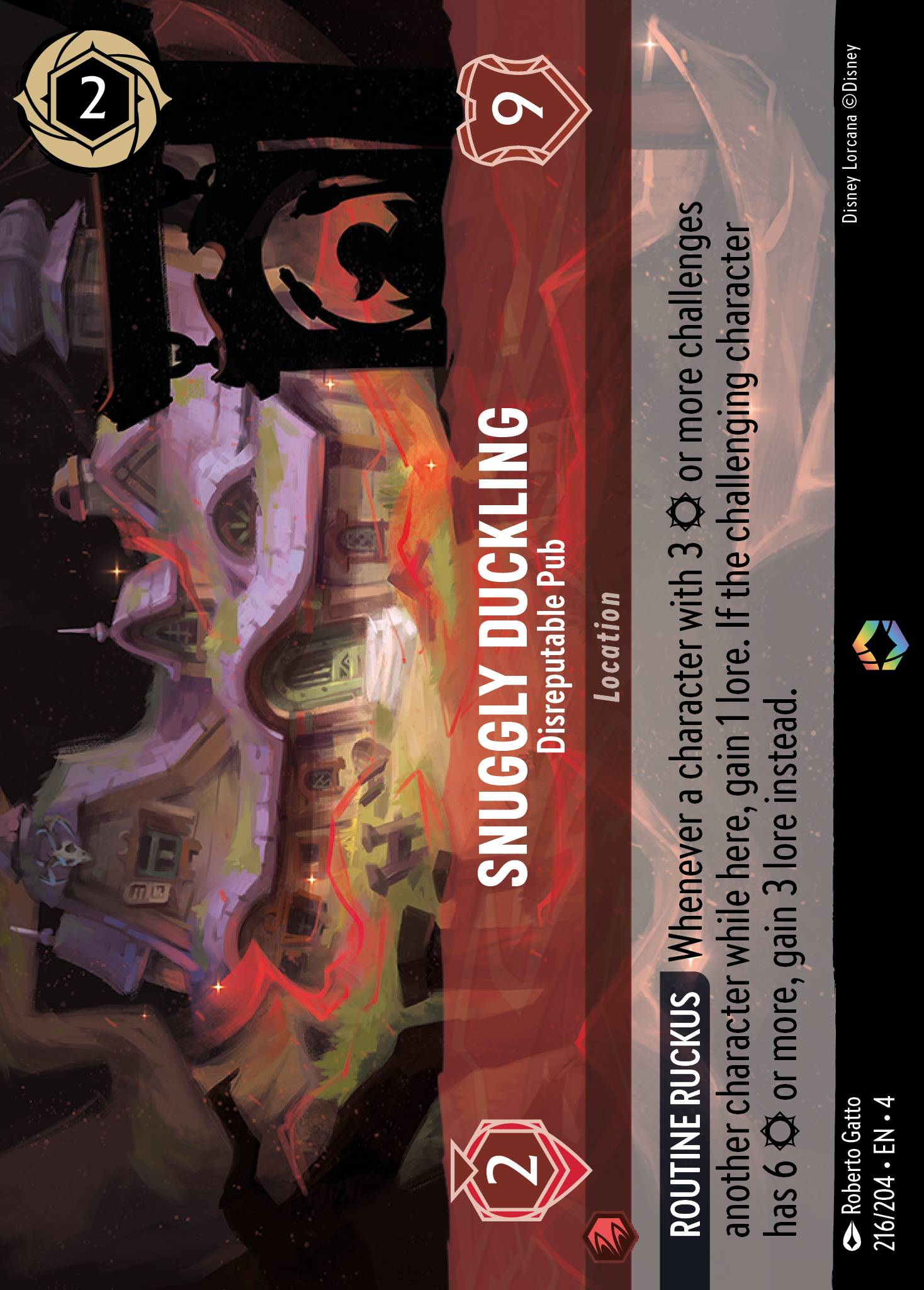 ROUTINE RUCKUS Whenever a character with 3 ¤ or more challenges another character while here, gain 1 lore. If the challenging character has 6 ¤ or more, gain 3 lore instead.