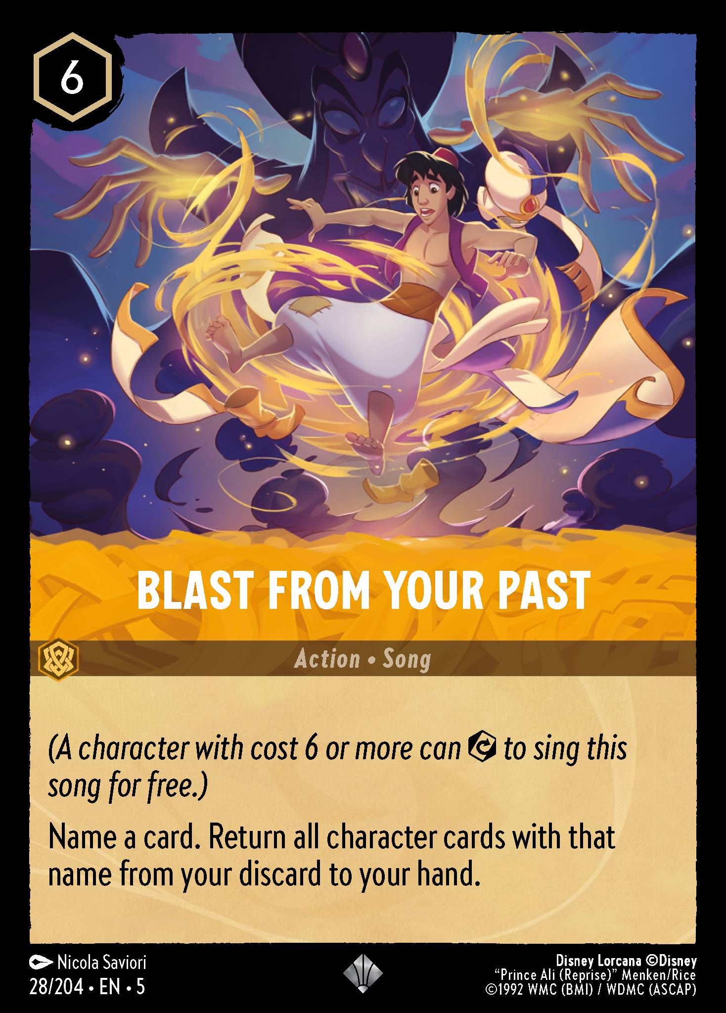 (A character with cost 6 or more can ⟳ to sing this song for free.) Name a card. Return all character cards with that name from your discard to your hand.
