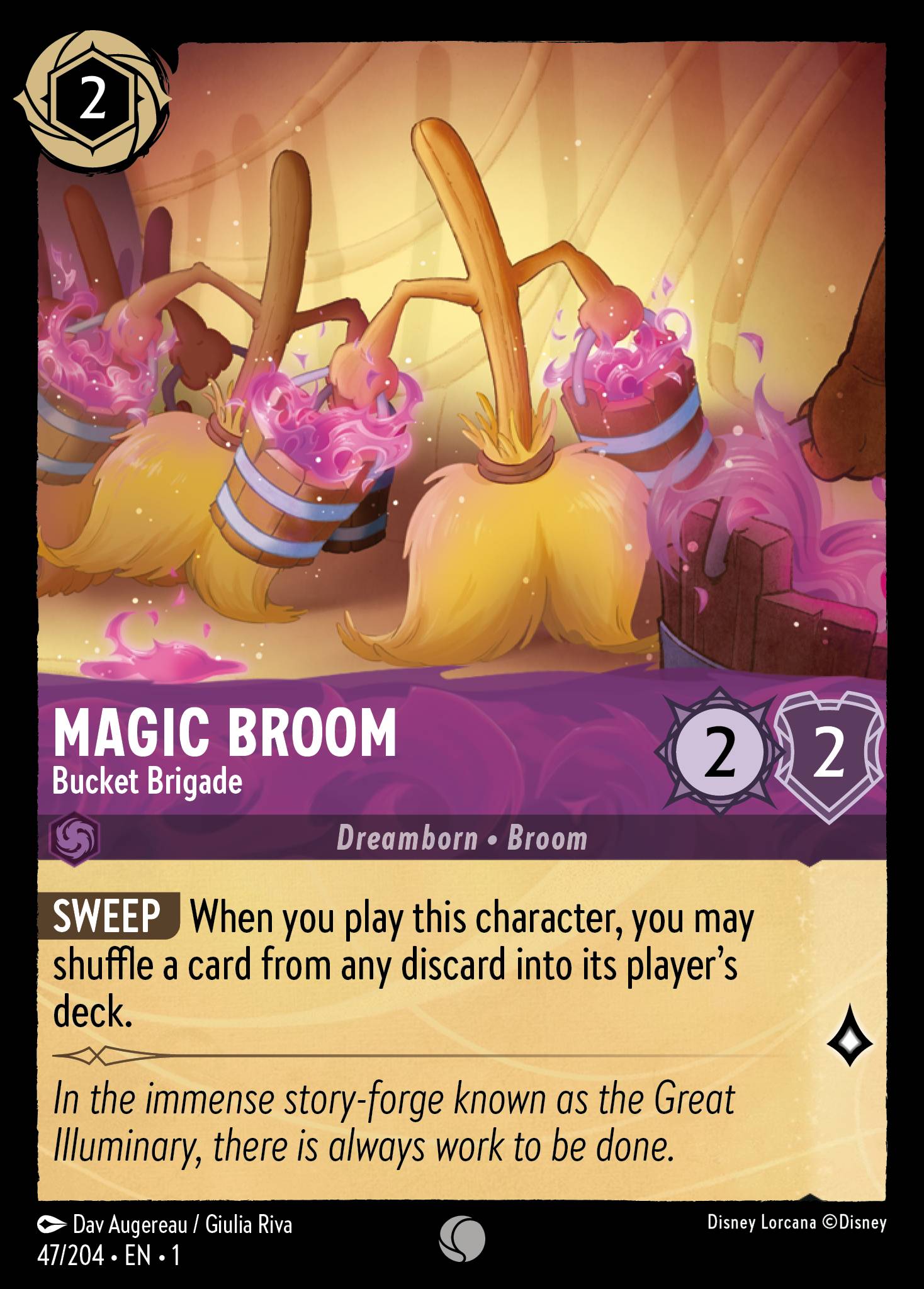 - Your Magic Broom will cost 2 ⬡ less, 1 ⬡ for each copy of Mickey Mouse - Wayward Sorcerer.