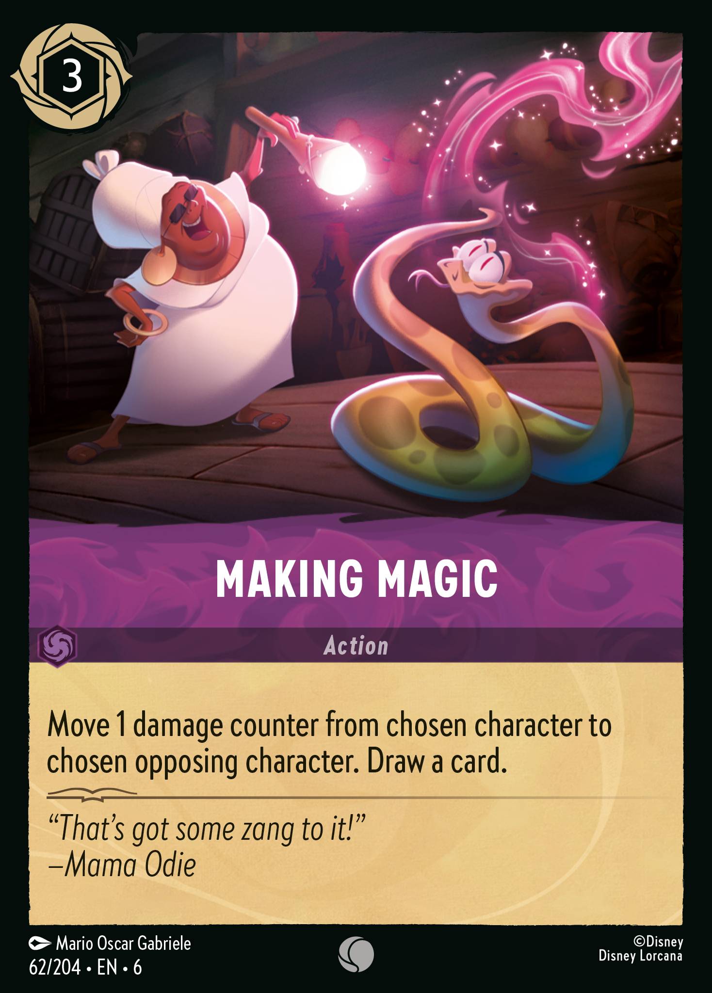 Move 1 damage counter from chosen character to chosen opposing character. Draw a card.