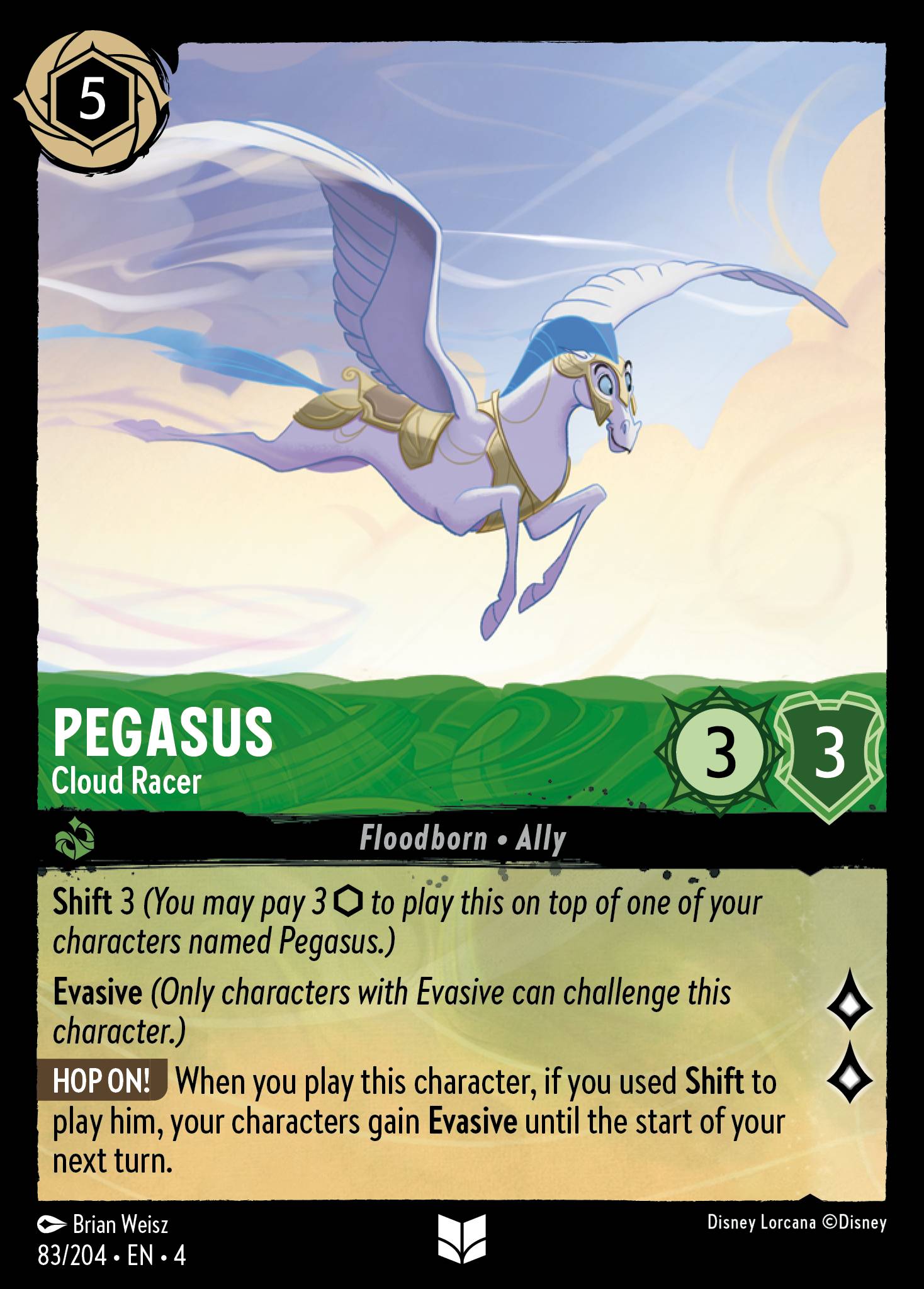 Shift 3 (You may pay 3 ⬡ to play this on top of one of your characters named Pegasus.) Evasive (Only characters with Evasive can challenge this character.) HOP ON! When you play this character, if you used Shift to play him, your characters gain Evasive until the start of your next turn.